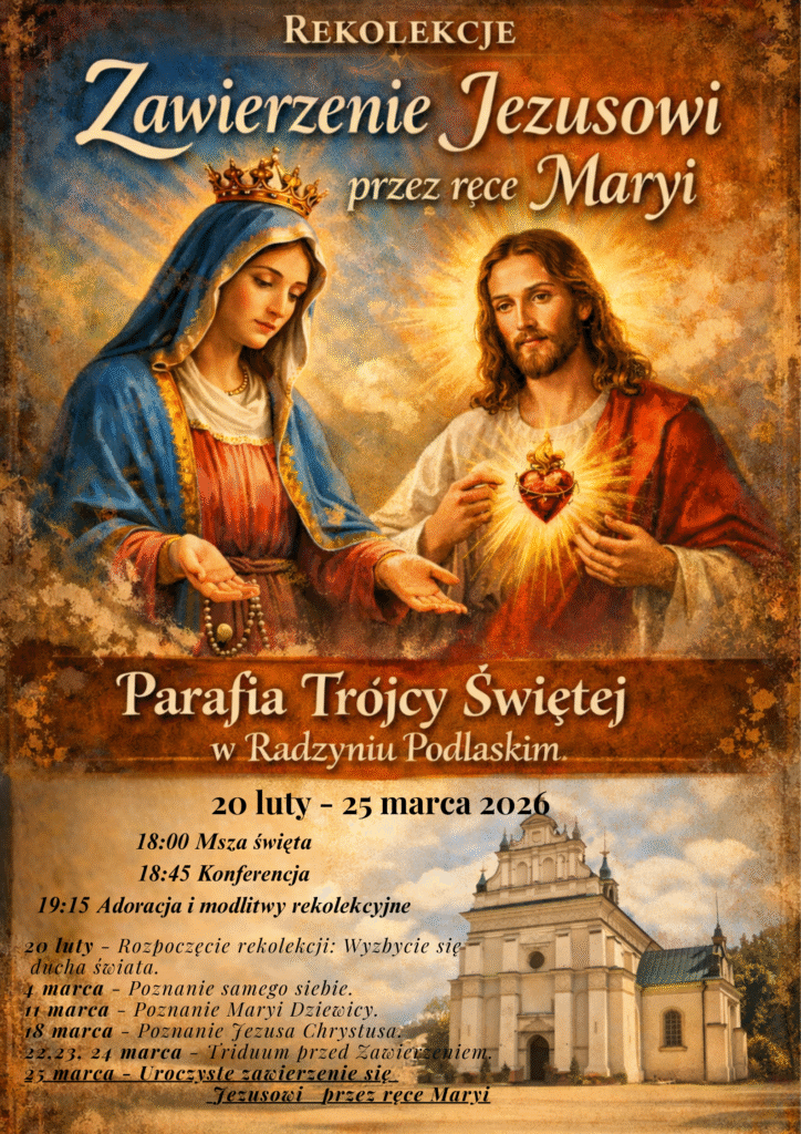 20 lutego w parafii pw. Trójcy Świętej w Radzyniu Podlaskim, rozpoczną się kolejne rekolekcje Zawierzenia Jezusowi przez Ręce Maryi. Zapraszamy wszystkich zawierzonych do odbycia rekolekcji i odnowienia zawierzenia, także nowe osoby, które chciałyby oddać swoje życie Jezusowi przez Ręce Niepokalanej. Zawierzenie dokona się 25 marca, w uroczystość Zwiastowania NMP. Rekolekcje poprowadzu ks. Grzegorz Góraj.